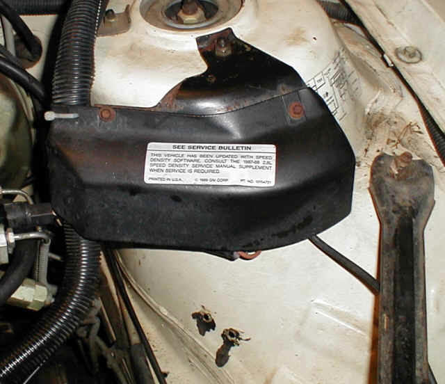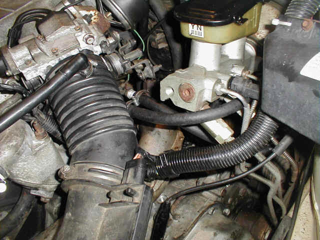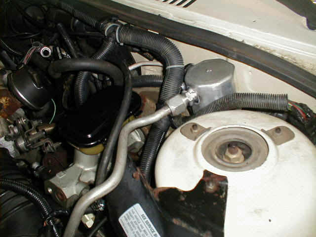 The increased width of the 2.8L engine over the 2.5L engine caused the A/C accumulator to have to be relocated. Shown here is the new home of the newly purchased A/C accumulator